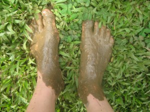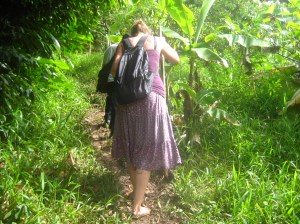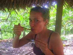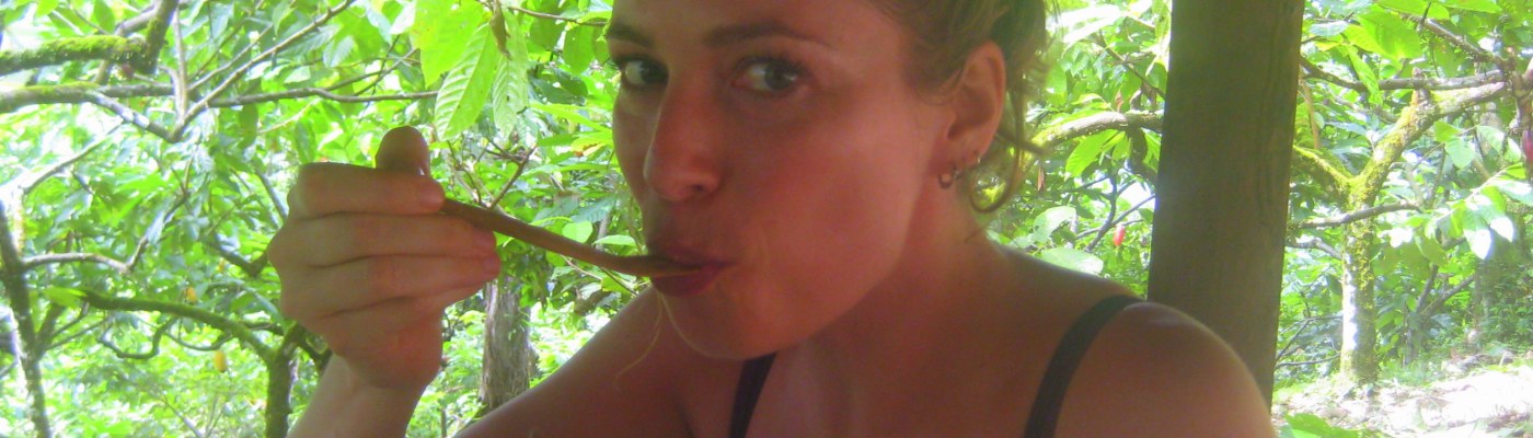 De (volledig biologische) cacaoplantage ligt op het vasteland, een bootritje van Bocas del Toro. Het bleek een enorme klim te worden, over een zeer modderig, en dus glibberig, pad. Helaas had niemand mij verteld dat slippers en een lange rok niet de gepaste kledij was voor deze tour. Aan de andere kant, geschikte schoenen hiervoor heb ik niet eens bij me dus ach. Na veel geglibber en geglij blootsvoets en met opgerolde rok verder geploeterd.