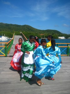 Dit om een cruiseschipje te verwelkomen. Een zeilboot met aan boord zo’n tachtig Engelsen. Een bliksembezoek van drie uur. Het hele dorp in rep en roer, cruiseschipjes komen hier maar zelden. Ik wilde een video tonen van de dans waarmee ze verwelkomd werden, maar daar denkt internet anders over. Een foto it is dus…voor nu tenminste.