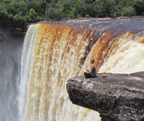 Een klein vliegtuigje met in totaal dertien personen brengt ons van Guyana’s hoofdstad Georgetown naar de waterval. De vlucht gaat over het uitgestrekte Guyanese regenwoud; één grote broccoli daar beneden. Na ruim een uur vliegen komt de indrukwekkende waterval in beeld. Als ons zeepkistje eenmaal is geland krijgen we een rondleiding langs de verschillende uitzichtpunten en uitleg over de plaatselijke flora en fauna. Zoals het bijzondere gouden kikkertje. Dit giftige knalgele kikkertje van misschien één centimeter groot leeft zijn hele leven in de zwembadjes in de gigantische bromelia, en komt alleen voor in dit gebied.
