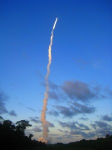 Het tweede hoogtepunt was de lancering van Ariane 5 vanaf het Centre Spatial Guyanais te Kourou. Deze lanceerbasis is hier gevestigd omdat de korte afstand tot de evenaar (drie graden), en dus de snellere draaiing van de aarde. Het ‘slingshot effect’ maakt lanceren veel voordeliger dan vanaf plekken verder van de evenaar. Bovendien is het gebied vrij van orkanen en aardbevingen. Driekwart van alle commerciële satellieten worden gelanceerd in Kourou.