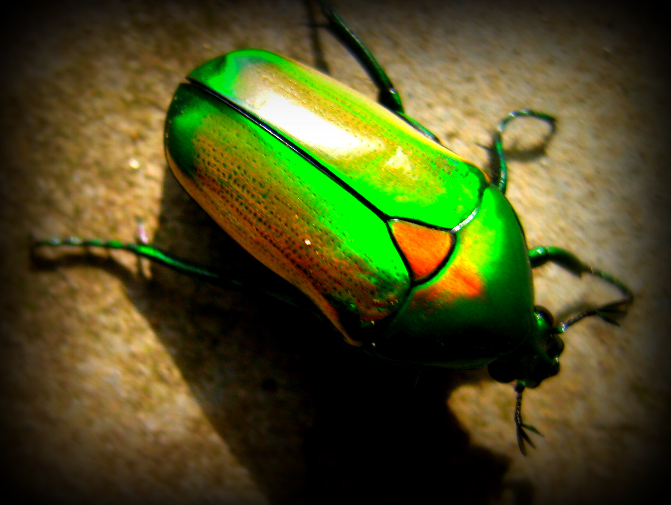 • De glimmende groene kever die in grote getale door de lucht zoeft.