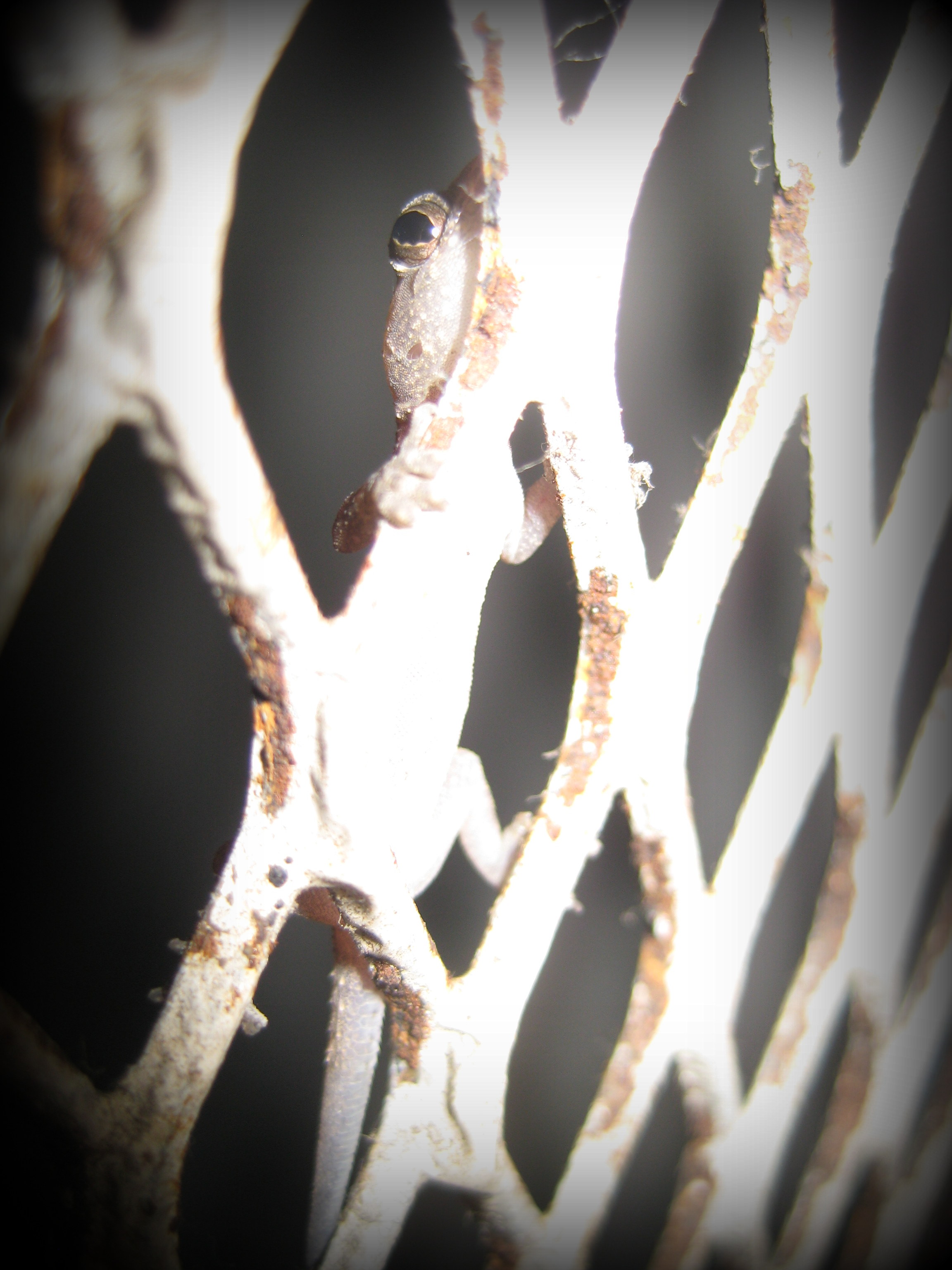 • De minuscule nog bijna doorzichtige gekko die dacht zich te kunnen verstoppen achter de tralies. Ik zag ‘em lekker toch.