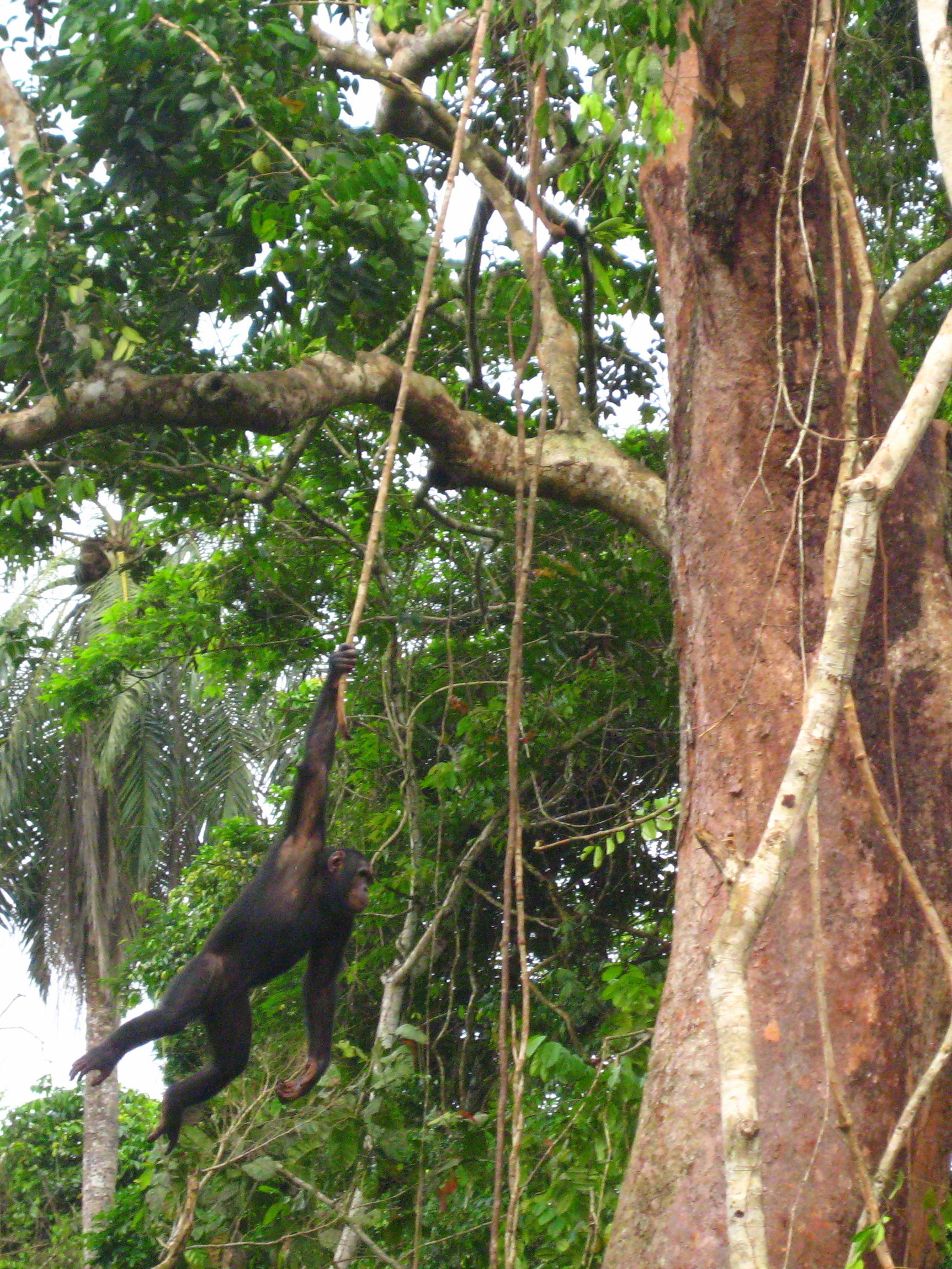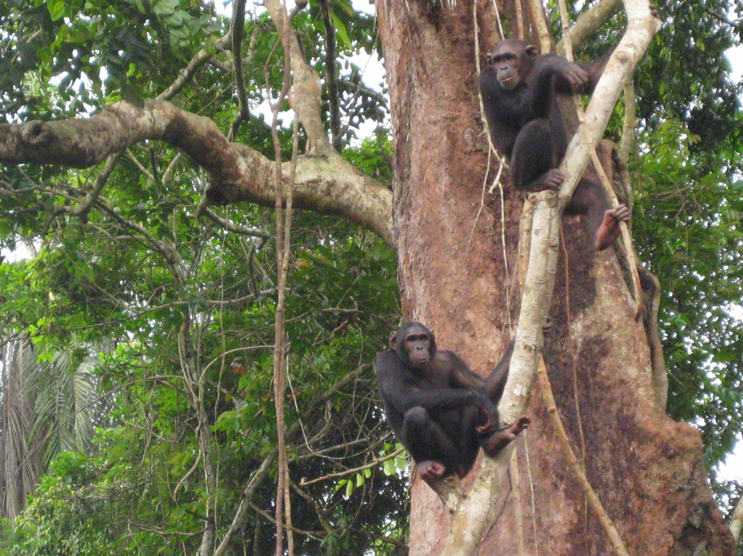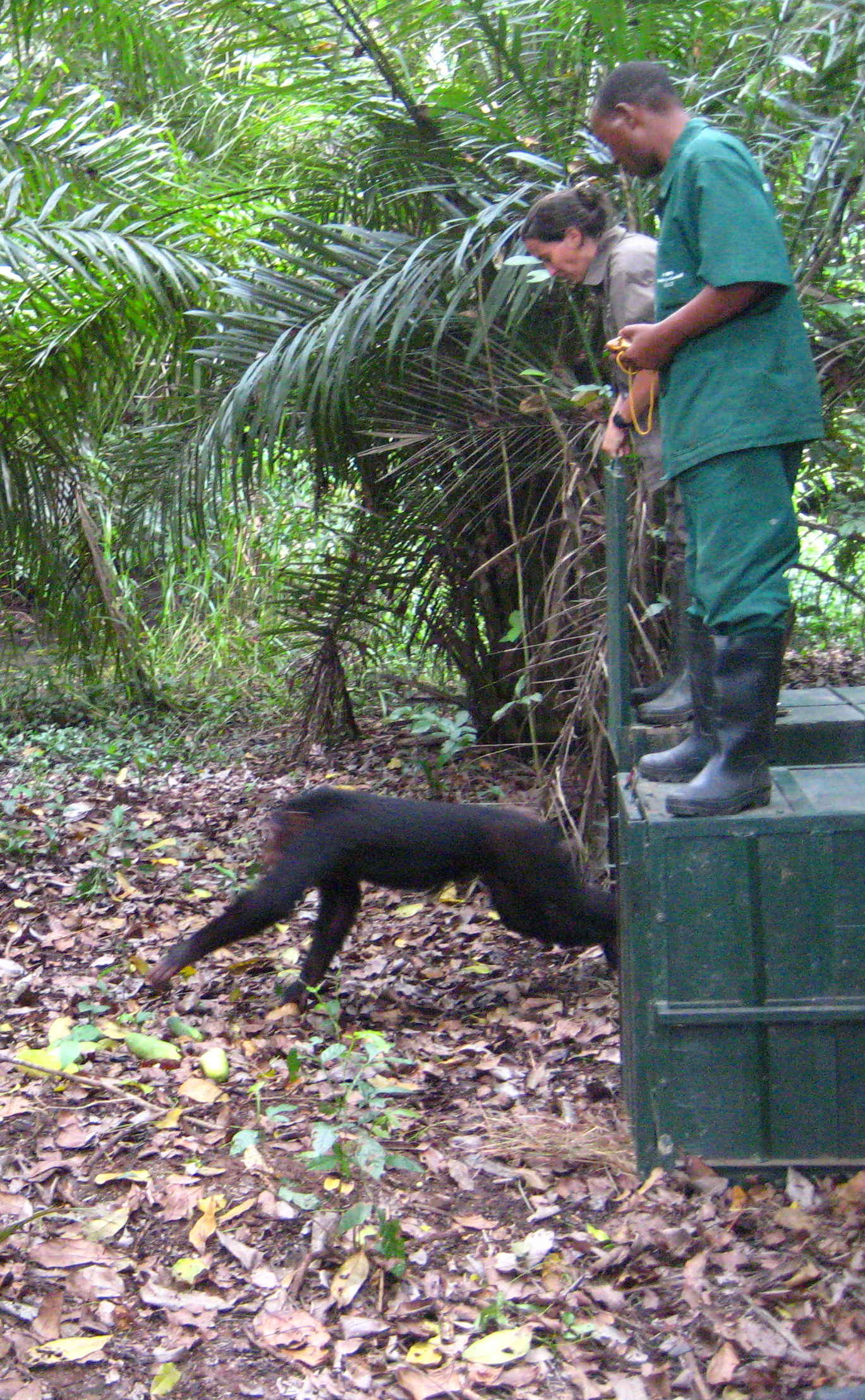 Ik had het geluk dat er tijdens mijn verblijf nog vier meisjes naar Tchindzoulou verhuisden. Nzouzou, Zimbana, Ngauo en Tchivgna ruilden de kale grond en klimrekken van hun verblijf om voor de metershoge bomen en dichte begroeiing van Tchindzoulou. Enigszins gespannen tuurden ze door de tralies tijdens de ongeveer één-uur durende reis, waarvan het laatste half uur over de machtige Kouilou rivier. Na haar vrijlating rende Ngaou vanuit haar krat meteen in de armen van een van de verzorgers, ze had even wat geruststelling nodig. Maar al snel zaten de meiden in de bomen, maakten ze kennis met de al aanwezige bewoners, en verkenden ze de omgeving. Het was indrukwekkend om de chimps te zien in hun natuurlijke omgeving, hoog in de bomen, slingerend aan de lianen. Met een gerust hart lieten we ze hier achter, voor deze chimps is een nieuw tijdperk aangebroken, eindelijk weer terug in het bos.