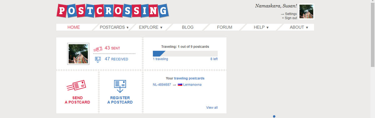 Ongeveer een half jaar geleden kwam ik achter het bestaan van Postcrossing, een internationaal project voor het uitwisselen van postkaarten. Je maakt een profiel aan, ontvangt kaarten van random mensen van over de hele wereld, en krijgt random adressen toegewezen om zelf kaarten naar te sturen. Je adres gaat pas ‘in de molen’ als een kaart die je gestuurd hebt geregistreerd is als ontvangen. Zo blijft het aantal ontvangen en verstuurde kaarten ongeveer gelijk. Stuur je niks meer, dan ontvang je ook niks meer. Het is de gezelligheid, liefheid en kneuterigheid zelve en uitermate geschikt om nog een vleugje wereld mee te krijgen in micro-tijden.