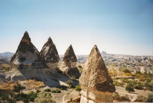 Verder op doortocht naar Cappadocia stopten we bij het museum annex graf van Mevlana Rumi, in Konya. Mevlana is de brenger van de Sufi mystiek, vooral bekend van de wervelende Derwishes. We waren nu al bijna in Nevshehir maar trokken eerst nog en dag uit voor een lange wandeling door de Ilhara vallei. Hier begon Cappadocia eigenlijk al, met zijn uiterst vreemde rotsen die soms als raketten, kegels, paddestoelen en dan weer als piemels in het landschap staan geploft. Een drietal vulkaanuitbarstingen bedekte dit land miljoenen jaren geleden onder tientallen meteres tufsteen. Vervolgens erodeerde die zachte substantie weer langzaam onder invloed van regen en wind. Op veel plekken was echter een harde toplaag ontstaan waardoor de tufsteen eronder niet gemakkelijk kon uitstlijten. Daardoor ontstonden er overal vreemde pieken en plooiingen met vaak een enorm rotsblok als hoedje. Erg gelachen soms maar vooral ons verbaasd over het ongelofelijk afwisselende en fantastische gebied. De tocht door de vallei was de wandeling van ons leven. Het was een aaneenschakelink van oooh’s en aaah’s: soms flink klauteren over en onder woeste rotsblokken, dan weer door een vlak veldje met koeien en ezels, om vervolgens te worden opgewacht door een decor uit willekeurig welke science fiction film. Tis opnieuw net de Efteling, maar dan echt. Na elke bocht van de rivierbedding werd je weer verrast door een compleet andere en buitenaards mooie aanblik. Behalve die knotsen is er in vroeger tijden ook driftig gehakt en gekrast en gefrescood hier door de Christenen. Om de haverklap legden zij kerkjes aan in de zachte tufsteen die zich uitermate goed leent voor het uitgraven en uithakken van huizen, tunnels, wijnmakerijen, kerken dus, en wat dies meer zij. Daarbij waren hun dorpjes op die onverwachte plekken erg moeilijk te vinden voor iconoclasten en zo is er nog heel wat bewaard gebleven voor het nageslacht en voor Nijmeegse toeristen. Twee dagen later maakten we opnieuw een tocht door weer andere valleien, dit keer in Goreme. De eigenaar van de camping, die in alle opzichten leek op wijlen Herman Brood, bood aan om ons door het merkwaardige land te loodsen. We liepen met hem en zijn eveneens geschifte hond zes uur door de roze vallei, de duivenvallei en de rozenvallei. Van onze gids leerden we alle vruchten en eetbare planten kennen en ook de takken die je als sigaret kunt gebruiken. Wat is het toch leuk als je iets van de natuur kent: het brood, het water en de appels die we zelf hadden gekocht waren totaal overbodig. De herfskleuren en het herfstige zomerweer maakten alles compleet.