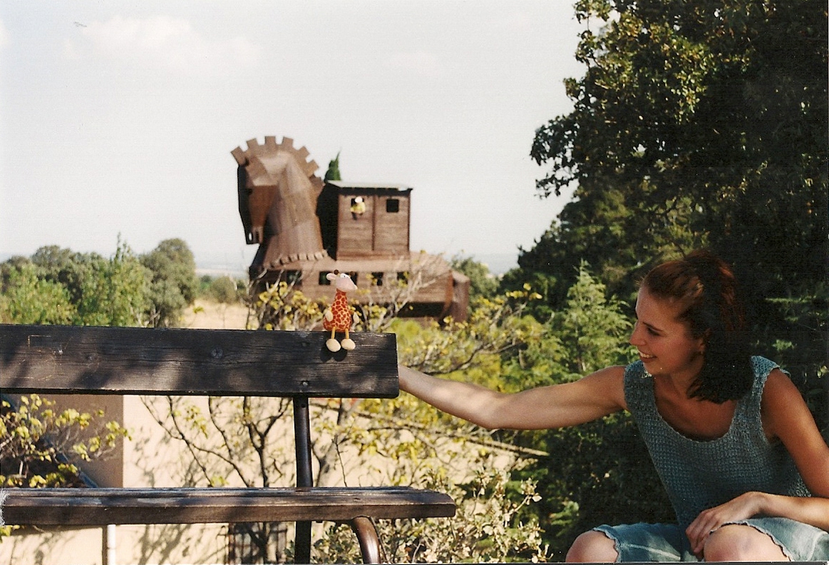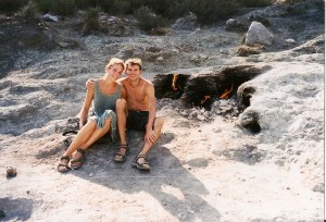 Myra was een eigenlijk slechts een tussenstop op onze weg naar de befaamde boomhutjes van Olympos. Deze plaats herbergt voor de verandering een Lycische ruine en een oud zeeroverskasteel in de kliffen, maar is toch vooral bekend als mega-leuk backpackersoord. ’s Zomers is het hier stampvol vanwege de knusse boomhutjes, geweldig weer, strand en alle andere accessoires voor rugzaktoeristen uit de hele wereld maar vooral uit Australie. Zo’n allerschattigst hutje namen we voor twee nachten en daarna zetten wij ons op de bijbehorende camping om de kosten wat te drukken. Het was een zeer gezellig complex met vele zitjes vol kussens, allerlei spelletjes om te spelen, een tv met BBC en Euronews, een bar, twee uitermate trouwe hondjes, en onbijt en heerlijk vegetarisch diner was bij de prijs inbegrepen. Voornamelijk vanwege dit heerlijke eten dat je elke avond werd voorgeschoteld en het niet hoeven doen van een afwas bleven we iets langer dan de bedoeling was, zes nachten in totaal. Behalve spelletjes, tv kijken, eten en wat in de kussen liggen deden we ook nog wel een paar cultureel verantwoorde dingen; onder andere het eeuwige vuur van Chimaera. Na een flinke wandeling en een behoorlijke klim in de zinderende hitte kwamen we opeens op een kale vlakte met overal vlammetjes. Hier komt ’t een of ander gas uit de aarde dat ontvlamd zodra het het aardoppervlak bereikt. Volgens de overlevering komt het vuur van een ooit door een dappere Griek verslagen draak die de aarde invluchtte en sindsdien zijn woedende, hete adem naar boven stoot. De turken claimen bovendien dat het idee van het olympisch vuur hier vandaan komt. Verwarrend, want het Griekse Olympus schijnt eveneens het patent op die fakkel te hebben. Vast een gevoelige kwestie.