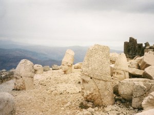 Na vier dagen hadden we genoeg van Cappadocia: we hadden alles wel zo’n beetje gezien, inclusief de acht verdiepingen diepe ondergrondse stad van Derinkuyu, en wat overbleef was standaard toeristenvermaak. Wat nu? Ongemerkt was het in dit deel van Turkije gemeen koud geworden ’s nachts. Steeg de temperatuur overdag nog tot boven de 20 graden, ’s nachts vroor het een beetje! Oei, het was niet echt warm in de bus en we hadden al onze kleren al aan. Aan de ene kant wilden we graag naar het noordelijker gelegen Sivas, want daar waren we immers uitgenodig bij onze kelner uit Kusadasi. Die zou rond deze tijd terug zijn in zijn geboorteplaats en wellicht bood het ons een mogelijkheid om eindelijk een echt in contact te komen met het Anatolische leven; een andere kant van Turkije die we eigenlijk nog nauwelijks hadden gezien. In Sivas zou het echter nog kouder zijn. Om die reden was een verder trek naar het Oosten voor ons al afgevallen. De Ararat, het Van-meer en andere plaatsen in de buurt van de Iraanse grens hadden we al afgestreept omdat de winter er echt aankwam. Sivas zou nog wel kunnen, evenals delen van de Zwarte Zee-kust. Aan de andere kant wilden we ook nog naar de Nemrut Dagi — de 2150 meter hoge berg Nemrut, spreek uit als Nemroet deuheuh. Maar die lag naar het zuiden en ook op die top werd het snel kouder. Zogauw er sneew viel werd de toegangsweg onbereikbaar. Gingen we naar Sivas, dan konden we ook de Nemrut schrappen. Wat was het beste? Precies op de splitsing van de wegen naar het noorden en het zuiden, in Gurup, besloten we naar Sivas te gaan en belden we Mustafa alvast vanuit een telefooncel. Maar die bleek nog helemaal niet uit Kusadasi te zijn vertrokken. Tsja, dan was het simpel. We sloegen dus meteen rechtsaf richting Nemrut en richting warmere nachten. De laatste 30 kilometer voor de top verliepen in slakkengang. Was de weg geasfalteerd dan was hij bochtig en stijl, was de weg wat vlakker dan ontbrak een wegdek. 10 kilometer voor de top kreeg je een combinatie van beide. Gek genoeg waren de allerlaatste kilometers van geweldige kwaliteit. Volgend jaar zou een compleet nieuwe weg gereed zijn. Voor ons deed het er niet toe want Rossinante kon alle ontberingen aan. Op de top was het uiteraard verlaten, en ongelooflijk koud. We kregen echter een zeer warm onthaal van de kaartjesverkoper die rond zijn kacheltje met thee zat te wachten tot de sneeuw kwam en hij eindelijk naar beneden naar de bewoonde wereld mocht. Die sneeuw zou niet lang meer op zich laten wachten; we waren dus nog net op tijd gekomen. Naast een fraai uitzicht — jammer van die regenwolken — was de bergtop bezaaid met gigantische beelden van onder meer Apollo, Zeus, Heracles en koning Antioche. Die laastste is niet zo bekend, maar de pief dacht dat hij het wel was en dat hij net zo’n grote was als die anderen en daarom liet hij de beelden van de goden uithakken met een van hemzelf erbij. Heel apart allemaal. Na de top konden de truien, jassen, sjaals, en handschoenen weer uit en hobbelden we weer heel langzaam naar beneden.