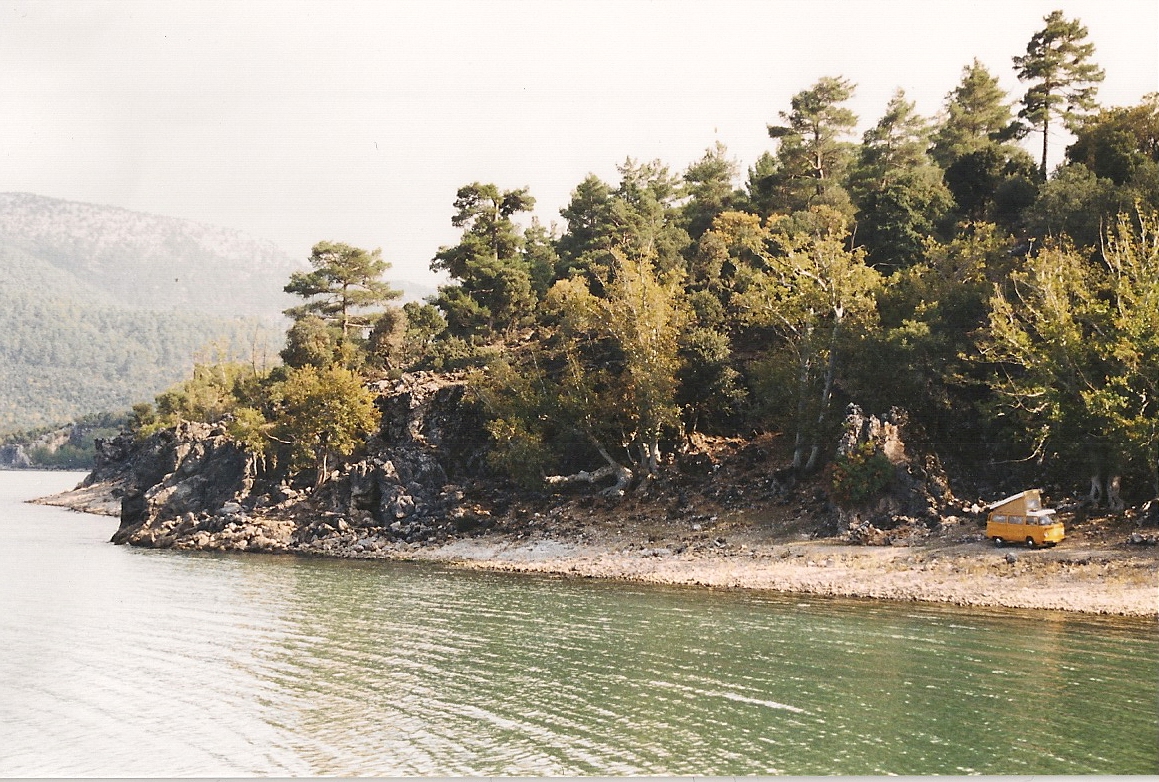 En nu zitten we op een prima camping in Dalyan, een klein en vrij leeg met een terrasje aan de rivier en uitzicht op de beroemde Lycische graftomben, uitgehouwen in de rotsen van Kounos; alles voor ons alleen. Privé waren ook het moderbad en thermaal –lichtelijk radioactief– bassin dat we gisteren namen. Hééérlijk! We voelen ons vijf jaar jonger en gezonder. Twee bootladingen toeristen leken ons de hele relax-middag te gaan vergezellen, maar zij bleken slechts dertig minuten gegund te zijn in de weldadige poelen. Grappig om te zien hoe een kudde zich in noodtempo insmeert met modder en zich meteen daarna uptempo weer moet afspoelen. Er stond toch duidelijk aangegeven dat je de klei minstens drie kwarties moest laten opdrogen annex intrekken… We lieten het gedraag gestaag aan ons voorbij gaan en hadden de rest van de middag de omgeving bijna helemaal voor onszelf. Zelfs de geur van niet meer zo verse eieren die van het warme bad wasemde, veroorzaakt door een weinig sulfur, mocht de pret niet drukken. In de modder van 25 graden bleef je ook nog eens gewichtloos ronddobberen. Top, top en nog eens top! Na de totale ontspanning kanooden we gezellig terug naar onze eigen camping. Helemaal privé is die trouwens niet meer. Gisteravond arriveerde een Zwitsers stel. Ze zijn voor de tweede keer langere tijd in Turkije. Nadat we vanmorgen door hen uitvoerig zijn ingelicht over de niet te missen natuur- en cultuurschoonheden die dit land nog voor ons in petto heeft, zijn we er defintief niet meer zo zeker van dat we nog veel verder komen dan Turkije. Het land houdt ons in zijn greep: er is nog zo veel te zien en de afstanden zijn nog zo immens. Een blik op de kaart en in onze beurs doet ons vermoeden dat we hier zeker nog wel twee maanden zoet kunnen blijven. Daarna is ons visum verlopen. Het geld zal tegen die tijd ook wel op zijn trouwens. Zelfs Iran lijkt een te optimistisch gekozen doel te zijn geworden. Niet dat we het niet hadden kunnen halen, maar Turkije verplicht je tot een gedegen en langdurig verblijf. Ook goed. Voorlopig kijken we slechts per 200 km vooruit. Na de zuidkust wachten Capadocië en de binnenlanden van Anatolië op ons. We verheugen ons er al op weg te komen van het nog zeer Westerse Turkije. Wel hopen we dat de gemoederen tussen West en Oost –om met deze hatelijke maar zo actuele tegenstelling te spreken– bedaard zullen blijven in dit land. We maken misscien wel een aardig doelwit, doelgeel eigenlijk, in het Oosten. Voorlopig is er van spanning nog helemaal niets te merken en ook kampeerders die juist uit de Islamische binnenlanden komen hebben enkel gastvrijheid ontmoet. Dat is fijn om te horen. Verdere bestemmigen (bijvoorbeeld rond Van, aan de noordgrens van Koerdistan en dichtbij de Iraanse en Armeense grens) zullen afhangen van animo, bus, financiën en politiek dus. Ach, nog te ver vooruit in alle opzichten om hier nu al onze bestemmingen te kiezen. Hoe dan ook blijft het voorlopig Turkije voor ons.