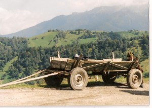 Dan de persoonlijke noot waarop jullie vast ook zitten te wachten: Roemenie is voor ons het eerst land waar het openbare leven echt anders is. Niet de vreselijke armoede tegengekomen die we soms gevreesd hadden (nog niet?) en veel betere wegen dan waar we ons op hadden voorbereid, maar wel veel paard en wagens, hooibergen met en zonder wielen, schaapherders en pruttelende gasfabrieken die vrachtauto’s moeten voorstellen. Het is een beetje wennen; gisteren vonden we alles nog prachtig, vooral de opdoemende Karpaten, maar vandaag toch een beetje overkil aan vervuiling en beroerde verkeerssituaties. Onze mama’s zouden zeker gezegd hebben “Och toch, net wie vreuger bie os”. Tsja, en nu zitten we zoals gezegd in het Internetcafe in Sibiu, een prachtig Middeleeuws stadje. Rossinante staat 3 kilometer verderop geparkeerd.