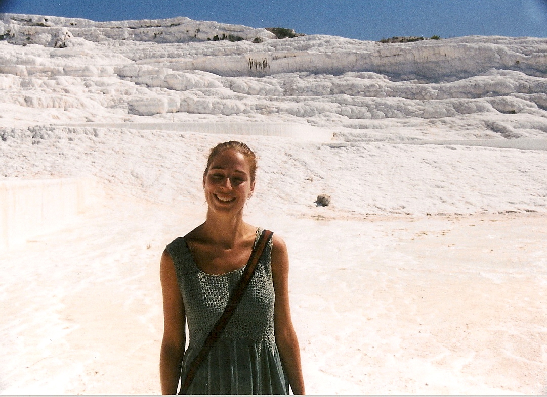 , ruim 200km landinwaarts. Naast de Grieks-Romeinse ruines van Hierapolis herbergt deze plaats wonderbaarlijke kalkformaties, ontstaan uit de bronnen in het nabije hooggebergte. Het naar beneden sijpelende water heeft bizarre terassen doen ontstaan van voornamelijk calcium en nog wat andere zouten. Het gebied is nog maar beperkt toegankelijk omdat toeristen het dreigden plat te trappen. Ruimte genoeg echter om al het moois te bewonderen. Blote voeten verplicht en heerlijk in het warme witte water. We verbleven op een eenvoudige camping, met heimwee naar Onder vanaf de eerste blik op het sanitair. De kinderen van de baas die na de aangeboden soepstengels weigerden om onze bus nog te verlaten, maakten veel goed.